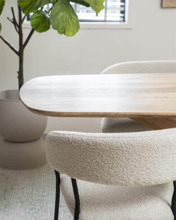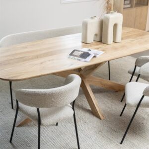 Ontdek de elegante Eettafel Nikki 240×100 – naturel, gemaakt van hoogwaardig acaciahout. Deze prachtige tafel biedt een royale ruimte van 240×100 cm, perfect voor gezellige diners en familiebijeenkomsten. De natuurlijke kleur en gelakte afwerking zorgen voor een warme en uitnodigende uitstraling in elke eetkamer. Met een stevige constructie en een gewicht van 82 kg staat de tafel garant voor stabiliteit en duurzaamheid. Dankzij het slimme Mix & Match-programma past de Nikki moeiteloos bij diverse interieurstijlen. De ruimte tussen de poten maakt comfortabele beenruimte mogelijk, met een hoogte van 73,5 cm. Voeg een vleugje verfijning toe aan je huis met deze stijlvolle eettafel.