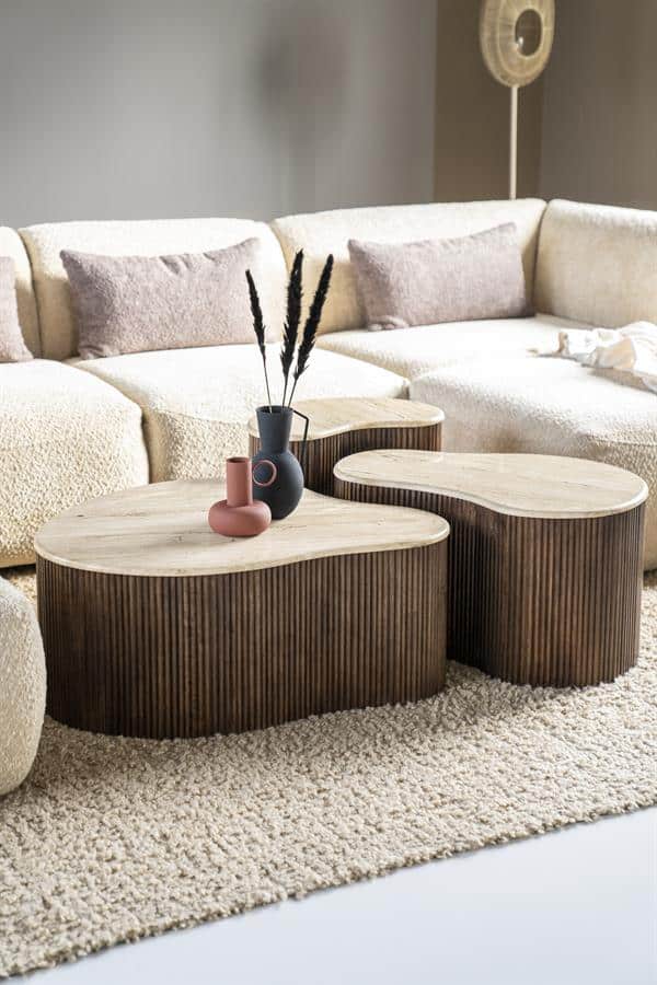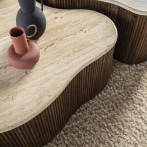 De Salontafel Mari – 83x72x34 is een elegante toevoeging aan je interieur. Gemaakt van duurzaam mango hout en verfijnd travertin, straalt deze tafel luxe en warmte uit. De bruine gelakte afwerking zorgt voor een rijke, natuurlijke uitstraling die naadloos in elke woonruimte past. Met een gewicht van 31 kg biedt de tafel stabiliteit zonder in te boeten aan stijl. De unieke vorm en afmetingen van 83x72x34 cm maken het een veelzijdig meubelstuk dat zowel functioneel als decoratief inzetbaar is. Kies voor de Salontafel Mari en verrijk je huis met een tijdloos design dat indruk maakt.
