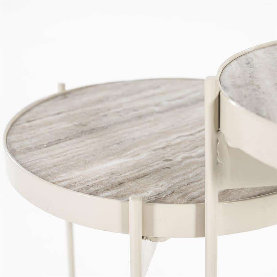 Ontdek de elegantie van de Side Table Sib (set van 2). Deze stijlvolle bijzettafels combineren beige metaal en uniek marmer voor een verfijnde uitstraling. Met afmetingen van 35x35x49 cm en 30x30x60 cm passen ze perfect in elke ruimte. Het gebruik van natuurlijk marmer maakt iedere tafel uniek, terwijl de stevige constructie een draagkracht van 20 kg biedt. Of je nu een drankje, een boek of decoratie wilt plaatsen, deze tafels zijn een ideale keuze. Onderhoud is eenvoudig met een vochtige of droge doek. Voeg een vleugje luxe toe aan je interieur met de Side Table Sib en geniet van tijdloze schoonheid en functionaliteit.