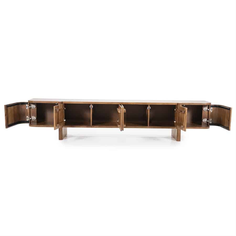 Ontdek het stijlvolle TV-meubel Julian van 240 cm met zes deuren, perfect voor elke moderne woonkamer. Gemaakt van hoogwaardig acaciahout en afgewerkt met een luxe lak, straalt dit meubel pure elegantie uit. De warme bruine tint voegt een natuurlijke charme toe aan je interieur. Met royale opbergruimte achter de deuren houd je je entertainmentruimte netjes en georganiseerd. Het stevige ontwerp, met een nettogewicht van 71 kg, zorgt voor een duurzame en stabiele basis voor al je multimedia-apparatuur. Het TV-meubel Julian combineert functionaliteit met een tijdloos design, waardoor het een onmisbaar stuk is voor elke liefhebber van stijl en comfort. Upgrade je woonruimte vandaag nog!
