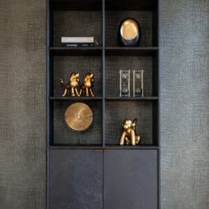 De Boekenkast Blackbone brass 2-deuren in black rustic is de perfecte aanvulling voor jouw interieur. Met zijn elegante ontwerp van stainless steel en eikenfineer straalt deze kast luxe uit. De subtiele brushed gold details maken het geheel af. De royale afmetingen van 220 x 100 x 40 cm bieden voldoende opbergruimte voor al je boeken en decoraties. Deze kast uit de Blackbone-collectie voegt een moderne en tijdloze uitstraling toe aan elke ruimte. Geef je interieur een stijlvolle upgrade met deze veelzijdige boekenkast die zowel functionaliteit als elegantie combineert. Ideaal voor de woonkamer, studeerkamer of kantoor!