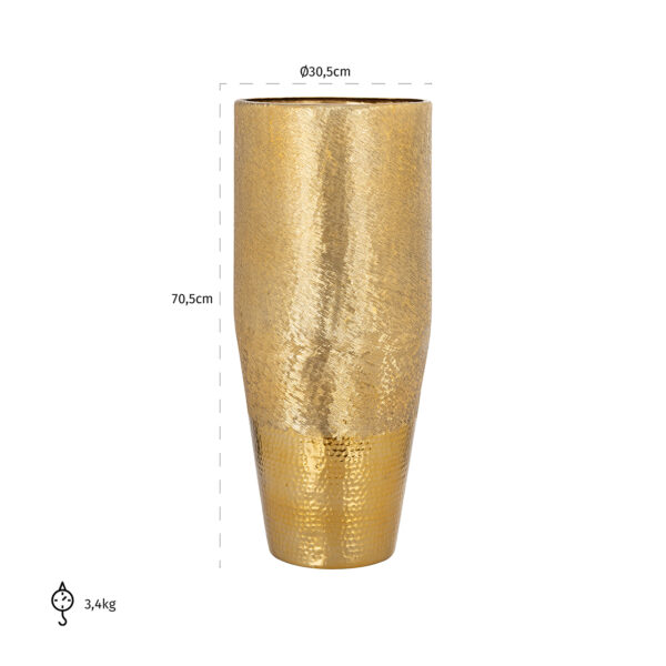 Voeg een vleugje luxe toe aan je interieur met de Vaas Nalim (Gold) uit de exclusieve Richmond Decoration collectie. Deze elegante vaas, vervaardigd uit hoogwaardig aluminium, straalt met zijn gouden afwerking puur raffinement uit. Met een indrukwekkende hoogte van 71 cm en een gewicht van 5,7 kg, vormt dit kunstwerk een echte blikvanger in elke ruimte. Perfect om bloemen in stijl te presenteren of als op zichzelf staande decoratie. Laat je interieur stralen en geniet van de tijdloze schoonheid van de Vaas Nalim.