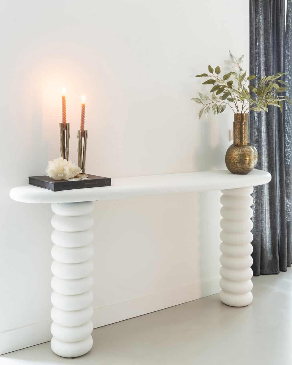 Ontdek de elegante charme van de Wandtafel Bloomstone 170×80 in White. Deze tafel combineert verfijnde stijl met praktische functionaliteit. Gemaakt van hoogwaardig MDF en afgewerkt met een lichte eco-plaster, straalt deze tafel moderniteit en duurzaamheid uit. Met zijn royale afmetingen van 82 x 170 cm biedt hij voldoende ruimte voor decoratieve items of als stijlvolle aanvulling in je interieur. De subtiele witte kleur past naadloos in elke woonruimte en voegt een frisse, minimalistische touch toe. Kies voor de Bloomstone collectie en transformeer je huis met een blikvanger die zowel praktisch als esthetisch aantrekkelijk is. Perfect voor wie op zoek is naar kwaliteit en stijl in één.