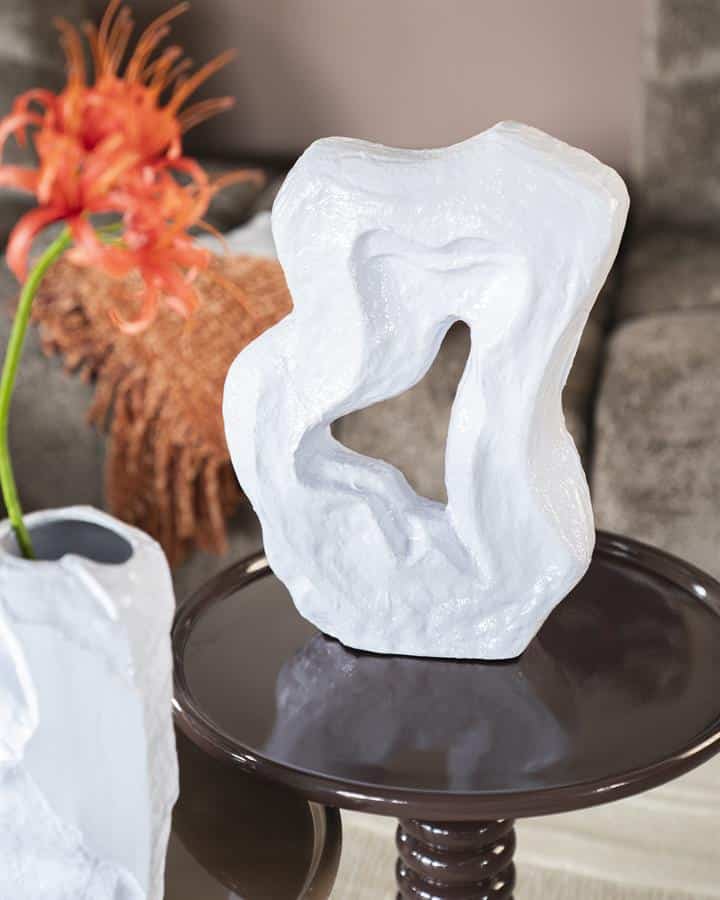 Ontdek de elegante schoonheid van Suelo. Deze unieke sculptuur, met zijn verfijnde witte tint en organische vormen, is een stijlvol kunstwerk dat iedere ruimte tot leven brengt. Gemaakt van hoogwaardig gecoat aluminium, biedt Suelo niet alleen visuele aantrekkingskracht, maar ook duurzaamheid. Met afmetingen van 28,5x10x40 cm past het perfect op een bijzettafel of in een open kast. Het onderhoud is eenvoudig: een zachte doek volstaat om zijn glans te behouden. Voeg een vleugje moderne kunst toe aan je interieur met Suelo uit de CONT collectie en ervaar de transformatie van je leefruimte.