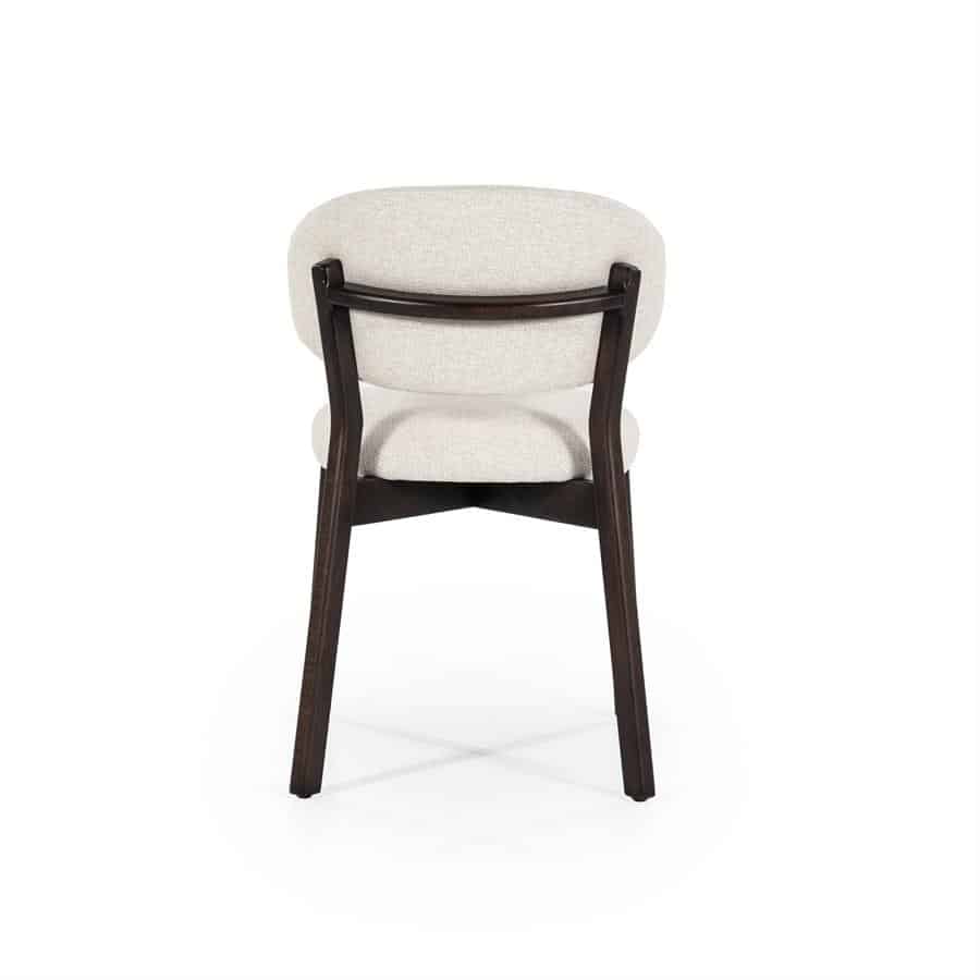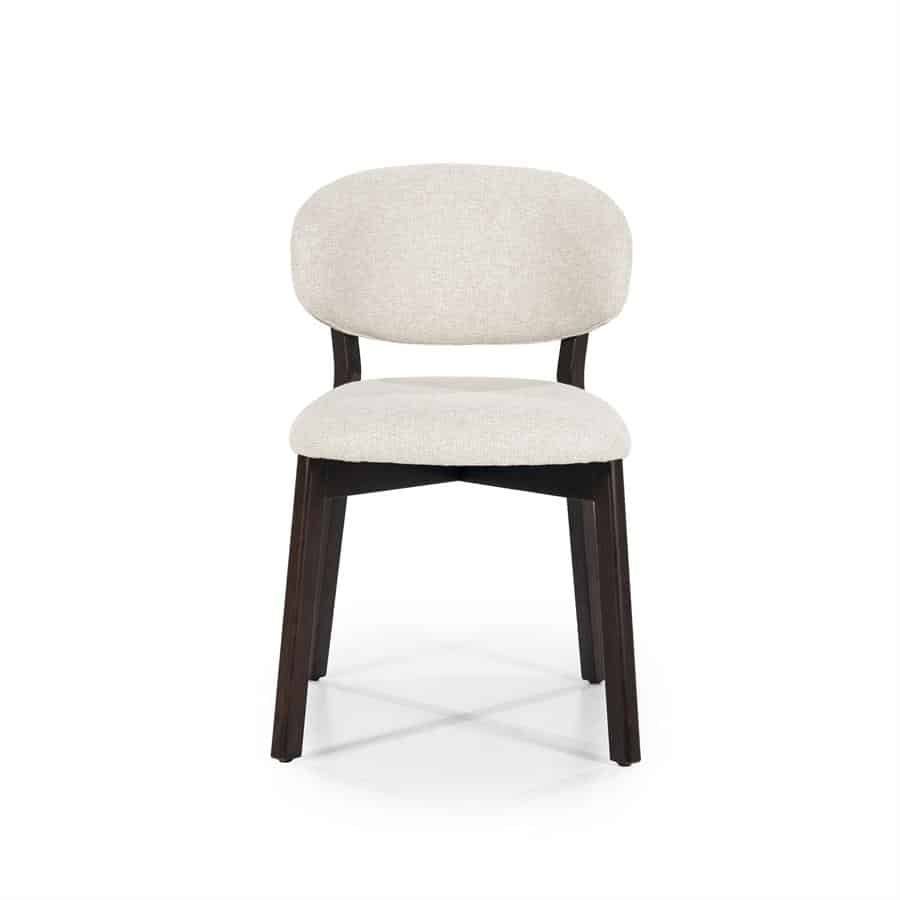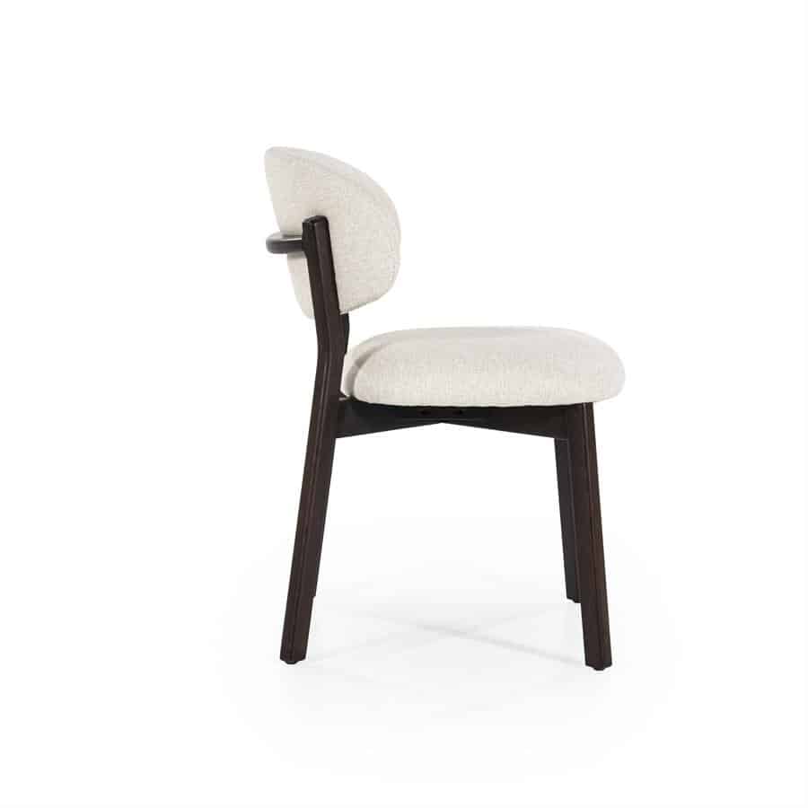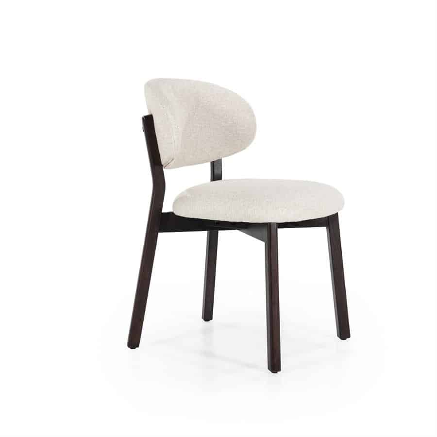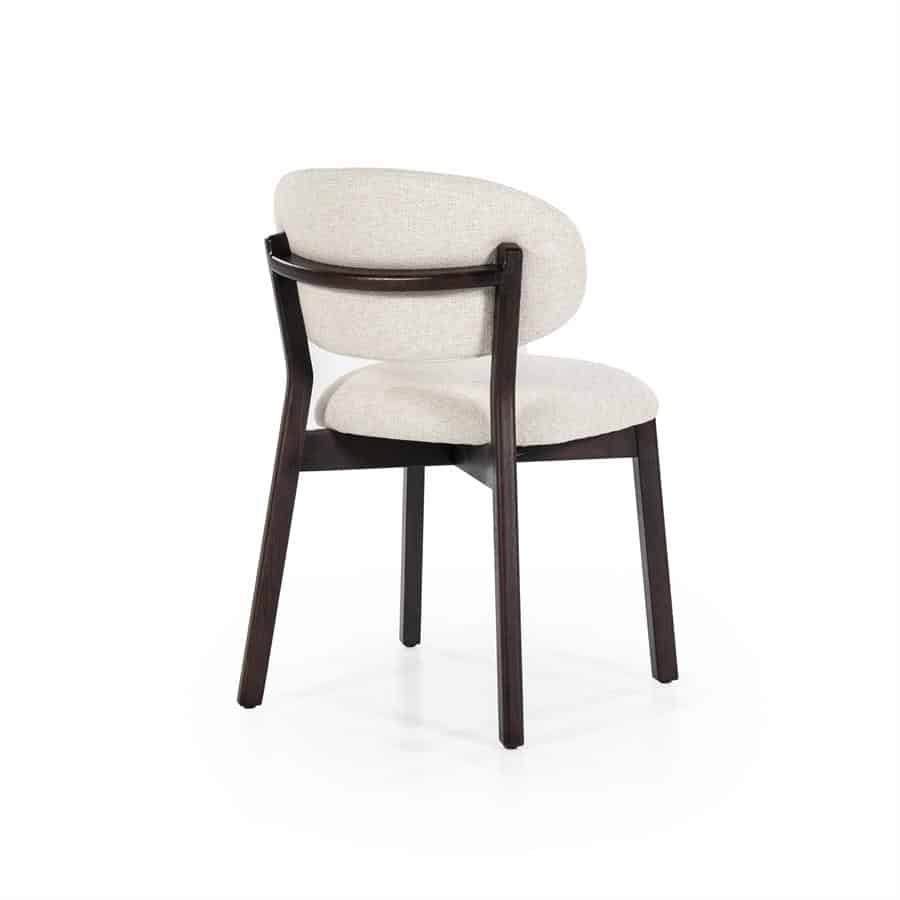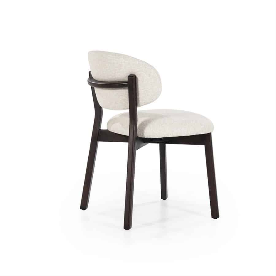 Stoel Mikky in de kleurcombinatie bruin – beige Moon is een stijlvolle eetkamerstoel met een knipoog naar retrodesign. Het frame is vervaardigd uit geverfd eikenhout in een warme, donkerbruine tint, terwijl de zitting en rugleuning bekleed zijn met een zachte beige stof (kleur: Moon) die zorgt voor een subtiele, eigentijdse uitstraling.