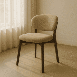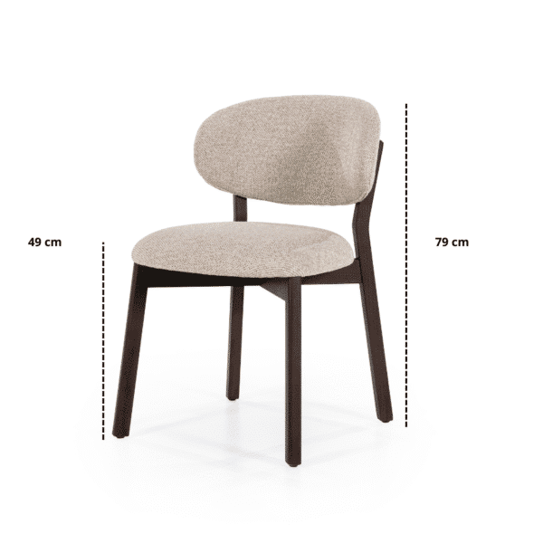 Stoel Mikky bruin – taupe Moon combineert een klassiek silhouet met moderne materialen. Het stevige frame van geverfd eikenhout in donkerbruin vormt een stijlvol contrast met de zachte zitting en rugleuning, bekleed in de stofkleur Moon – taupe. Deze warme, neutrale kleur geeft de stoel een tijdloze en toegankelijke uitstraling.