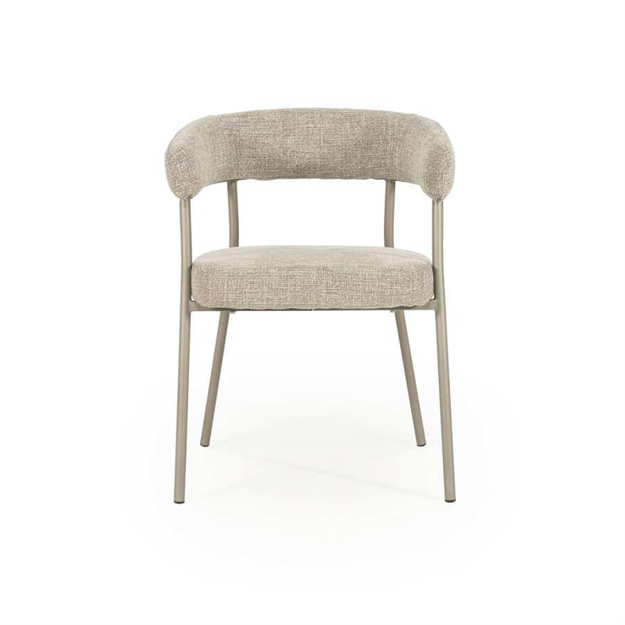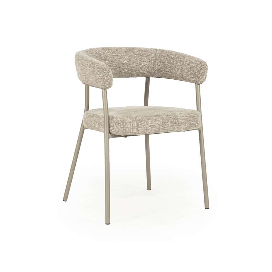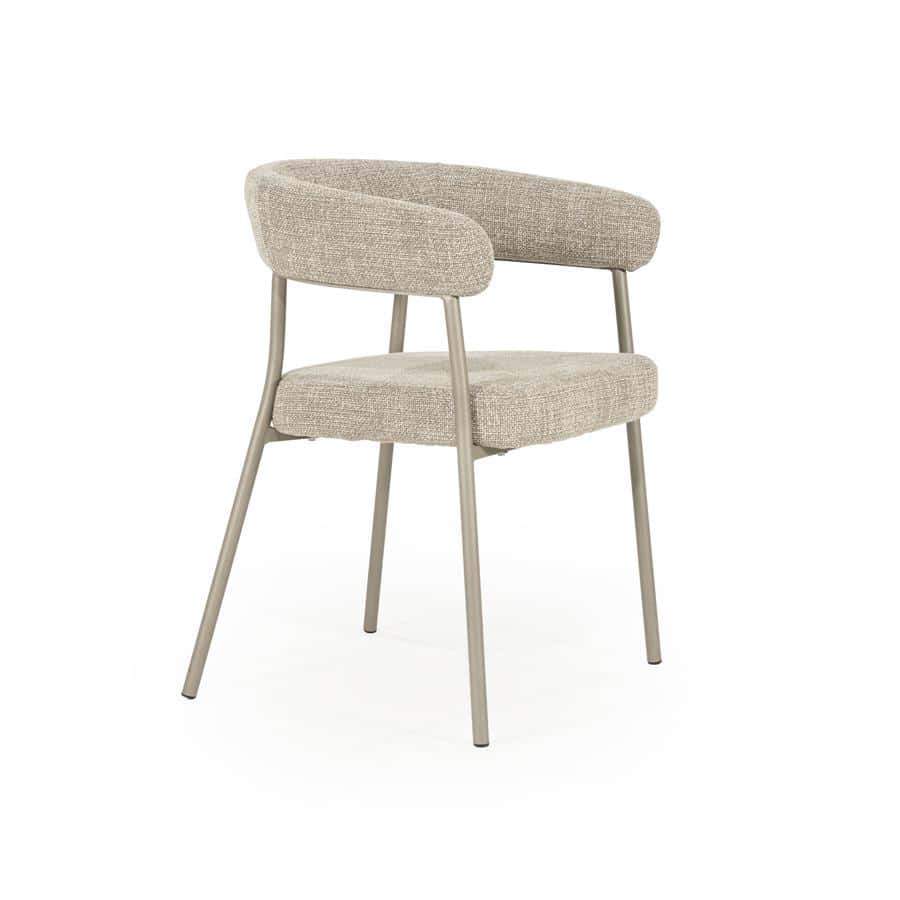De Yovi stoel in taupe is een stijlvolle en eigentijdse toevoeging aan elk interieur. Dankzij het verfijnde metalen frame in combinatie met de zachte bekleding in stof Fermo biedt deze stoel zowel een moderne uitstraling als uitstekend zitcomfort. De afgeronde rugleuning en licht gebogen armleuningen zorgen voor een elegante vorm en extra ondersteuning. Met een zithoogte van 49 cm en zitdiepte van 48 cm is de Yovi ideaal voor lange diners of als comfortabele bijzetstoel. Wordt geleverd per set van 2.